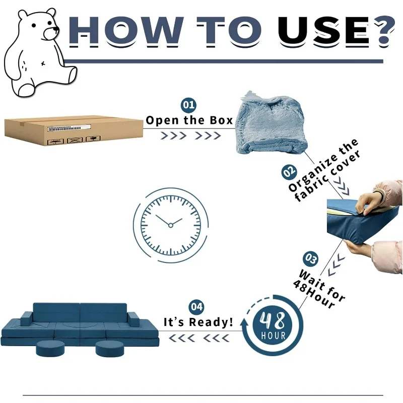 - Tips : Due to machine-compression packaging, The modular kids play couch will be deformed and thin.When you receive the goods, please remove all the packages and open the zippers immediately, waiting for 48-72 hours with patience, then the foam will be restored to its original thickness and shape slowly. If you want to expedite foam recovery and remove sectional wrinkles, it can be achieved by using a hair dryer or garment steamer